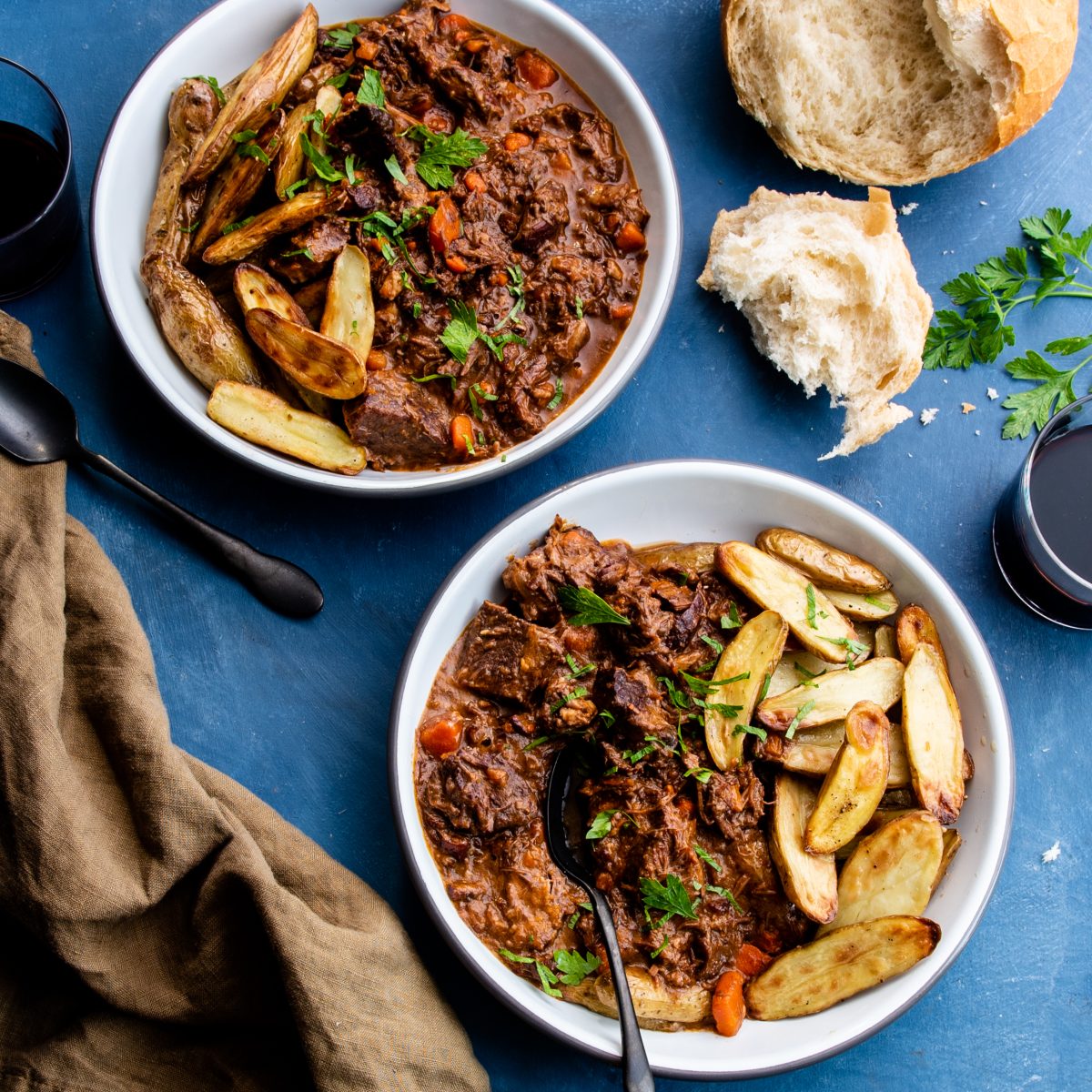 The origin of the the Beef Bourguignon recipe actually stems from Burgundy, France. It developed as a peasant dish in the medieval era, utilizing slow-cooking extremely tough meat using inexpensive wine. This method would maximize flavor and tenderness in the meat. It was first documented in the 20th century and is still now an incredibly popular and easy recipe to execute. It has since evolved from a rustic stew into a cozy and delicious dish to cook for you and your loved ones! Our recipe serves six to eight guests.